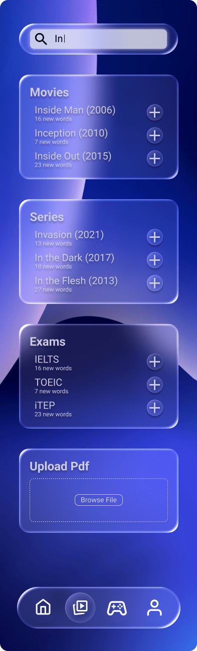 Beginne damit, einen Film auszuwählen, den du gern schaust, oder lade dein eigenes PDF hoch. Du kannst auch aus einer Liste beliebter Filme, Serien oder Pakete wählen. Das stellt sicher, dass der Lernprozess angenehm ist und du motiviert bleibst, weil du etwas siehst, das dich interessiert.